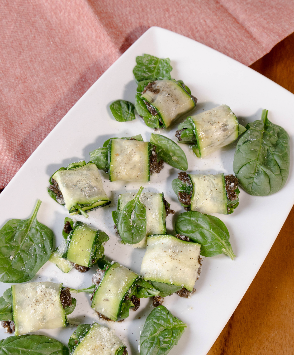 - Arrange the courgette rolls on a plate over a bed of fresh spinach.