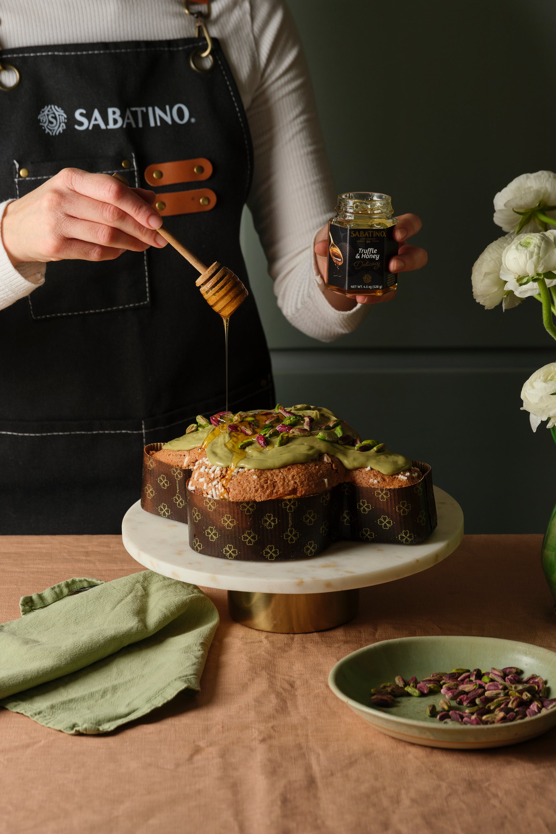 A beloved centerpiece of Italian Easter traditions, the Colomba cake symbolizes renewal and peace, often savored with coffee, dessert wine, or simply on its own. We've reimagined this classic with a vibrant touch of pistachio cream and a decadent drizzle of our Sabatino Truffle Honey