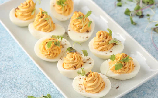 - Using a pastry bag fitted with a star tip, pipe yolk mixture forming a rosette into whites. Serve immediately or chill for up to 2 hours.